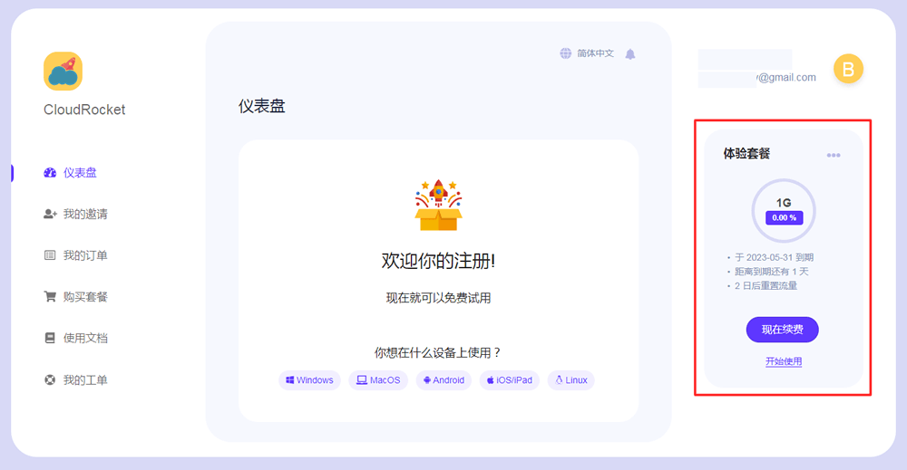 当你注册后,系统会自动分配"体验套餐"给你,如图所示。